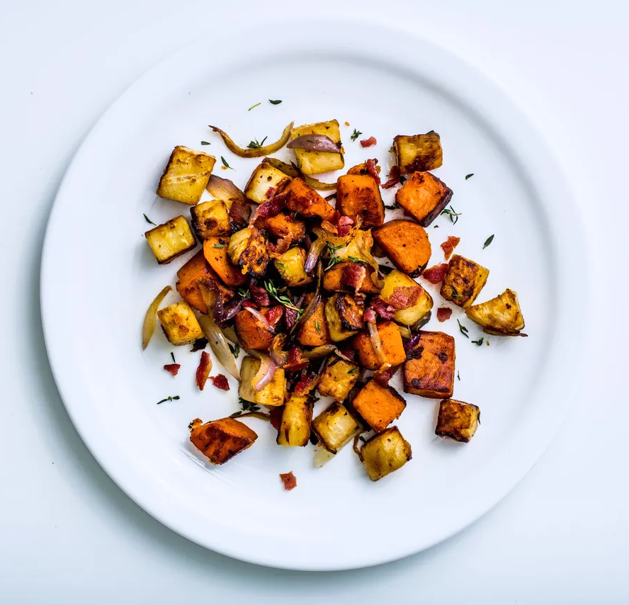 Add 1 sliced red onion and 1 thinly sliced garlic clove. Season with salt and pepper, then continue cooking, tossing frequently and scraping up browned bits, until the vegetables are tender, about 30–35 minutes. Remove the thyme sprigs and bay leaf, then toss in 5 crumbled, cooked bacon slices. Serve topped with chopped fresh chives. Serves 4.